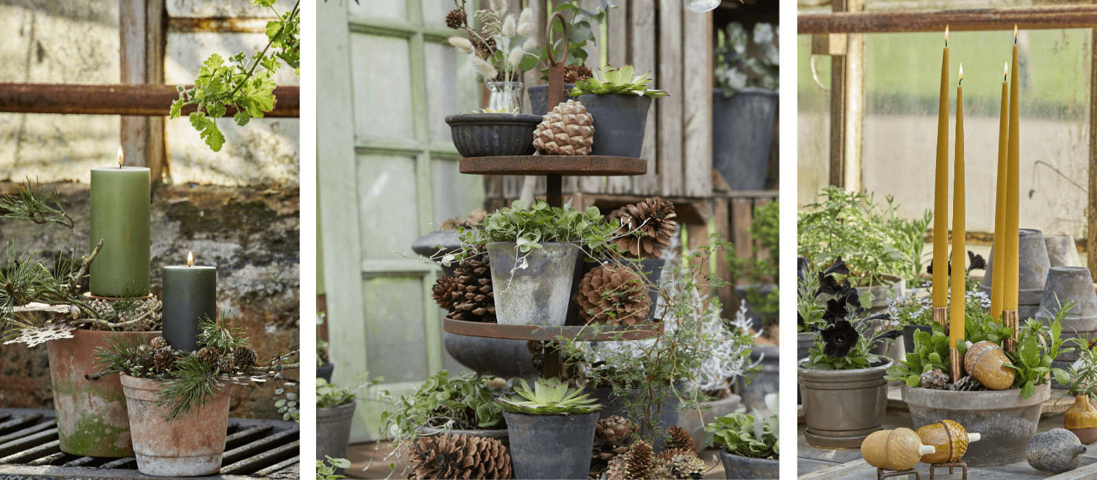 Vi elsker den uprætentiøse jul med patinerede krukker, der har charme og karakter. Hver krukke er unik og fortæller sin egen historie. Den har personlighed og sjæl, hvilket passer smukt til julens ånd. Sammen med kogler, gran og andet grønt bidrager vores krukker til den helt rigtige julestemning, som vækker sanserne til live og lader julefreden sænke sig.