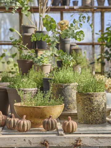 Gå på opdagelse i vores kollektion af diverse dekorationselementer som pottehængere og -stativer, glas, ornamenter, dekorative figurer samt vandkander og enkelte møbler.